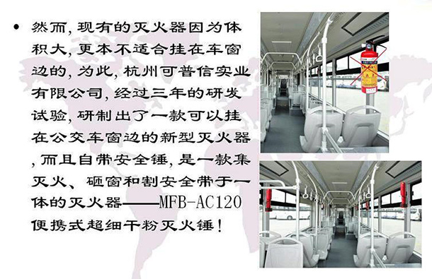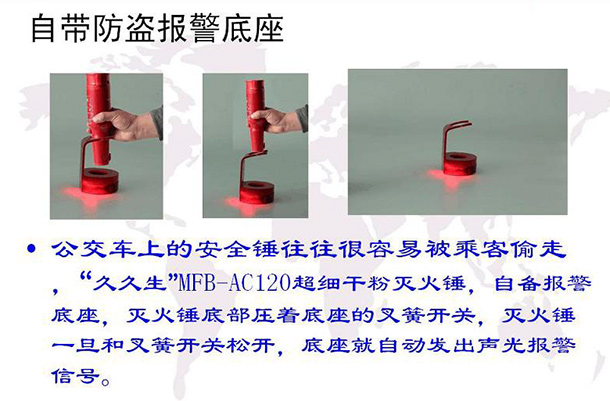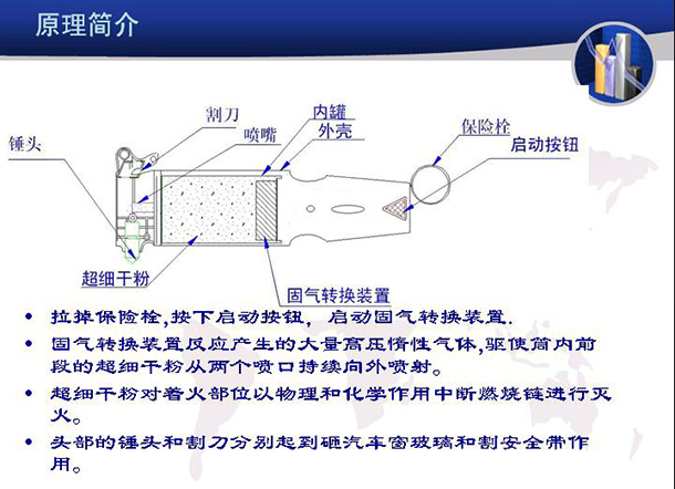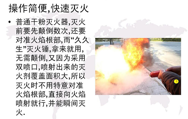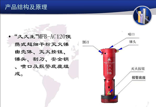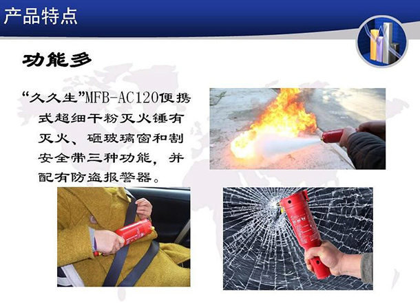 “久久生”便携式超细干粉灭火锤,是一款集灭火、砸汽车玻璃、割安全带、报警四大功能合为一体的产品,突破了传统的车用灭火器和安全锤分离的理念,极大的方便了司乘人员的安全操作、能够让司乘人员以最快的速度逃生,给广大司乘人员带来了极大的安全保障!